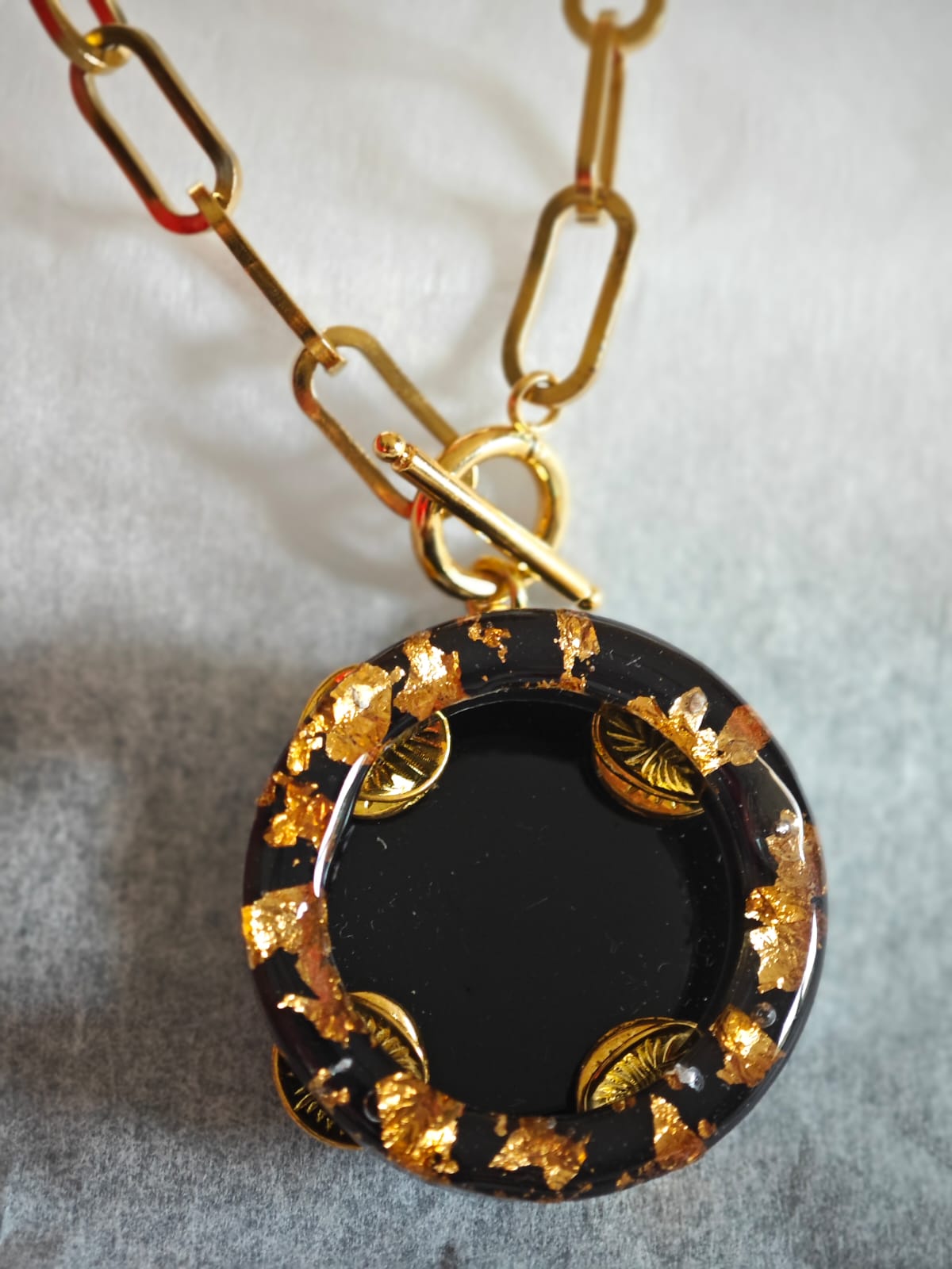 Descubre la belleza y la elegancia de nuestro colgante en acero inoxidable con baño de oro y una exquisita pieza de resina hecha a mano. Cada detalle de este collar ha sido cuidadosamente elaborado mediante un minucioso proceso, resultando en una pandereta única y sorprendente, incluso con sus ferrallas.