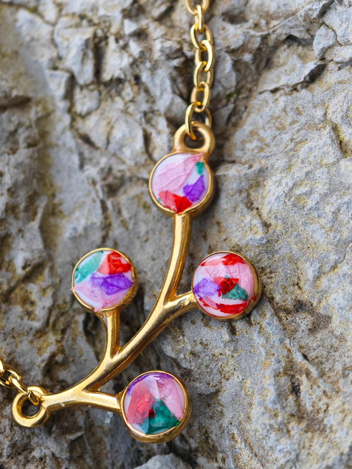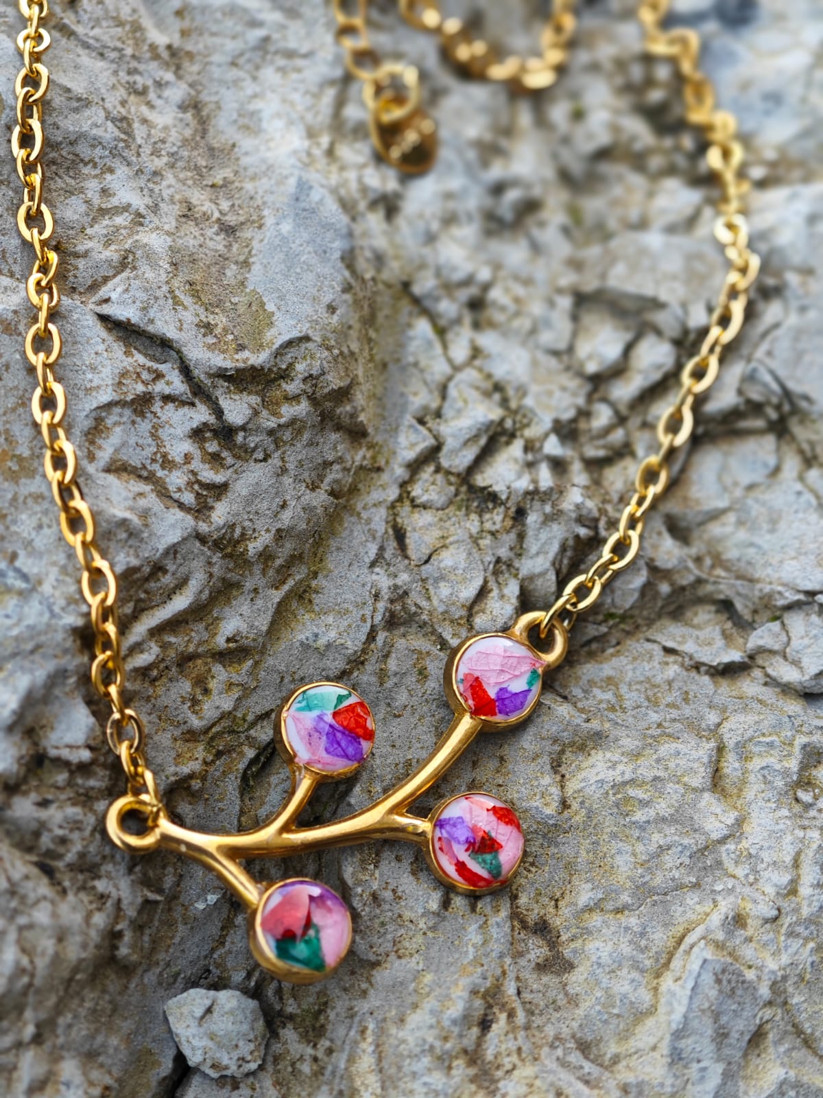 Al tratarse de flores naturales, no hay dos piezas iguales. Cada gargantilla conserva fragmentos reales de pétalos cuidadosamente seleccionados y preservados para mantener su color y textura, convirtiéndola en una joya con alma.