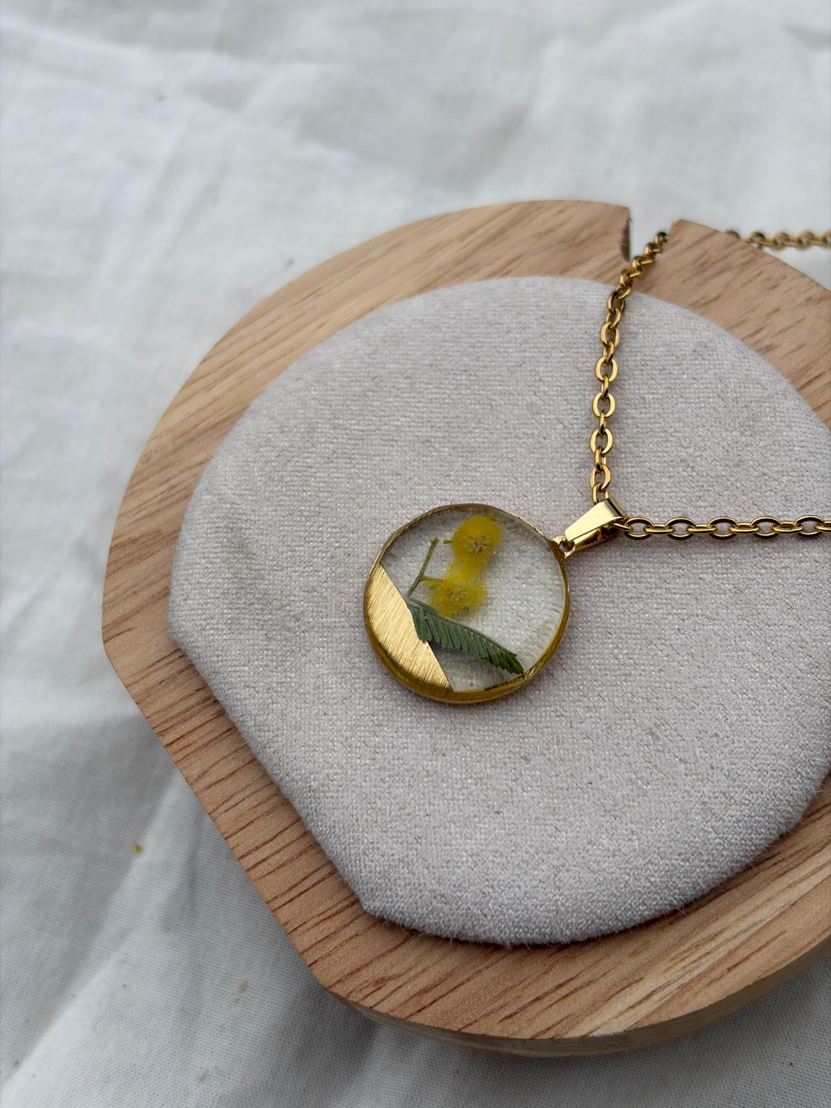 Ya sea como un regalo especial o como un accesorio para ti misma, este colgante de mimosa es una celebración de la belleza natural y la artesanía.