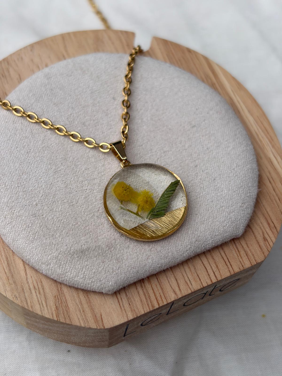Descubre la belleza de la naturaleza con este exclusivo colgante de mimosa. Una pieza única que refleja el amor y la dedicación que ponemos en cada creación. Cada colgante está hecho a mano, desde la recolección cuidadosa de flores de mimosa, que recojo personalmente en su estado más fresco y vibrante.