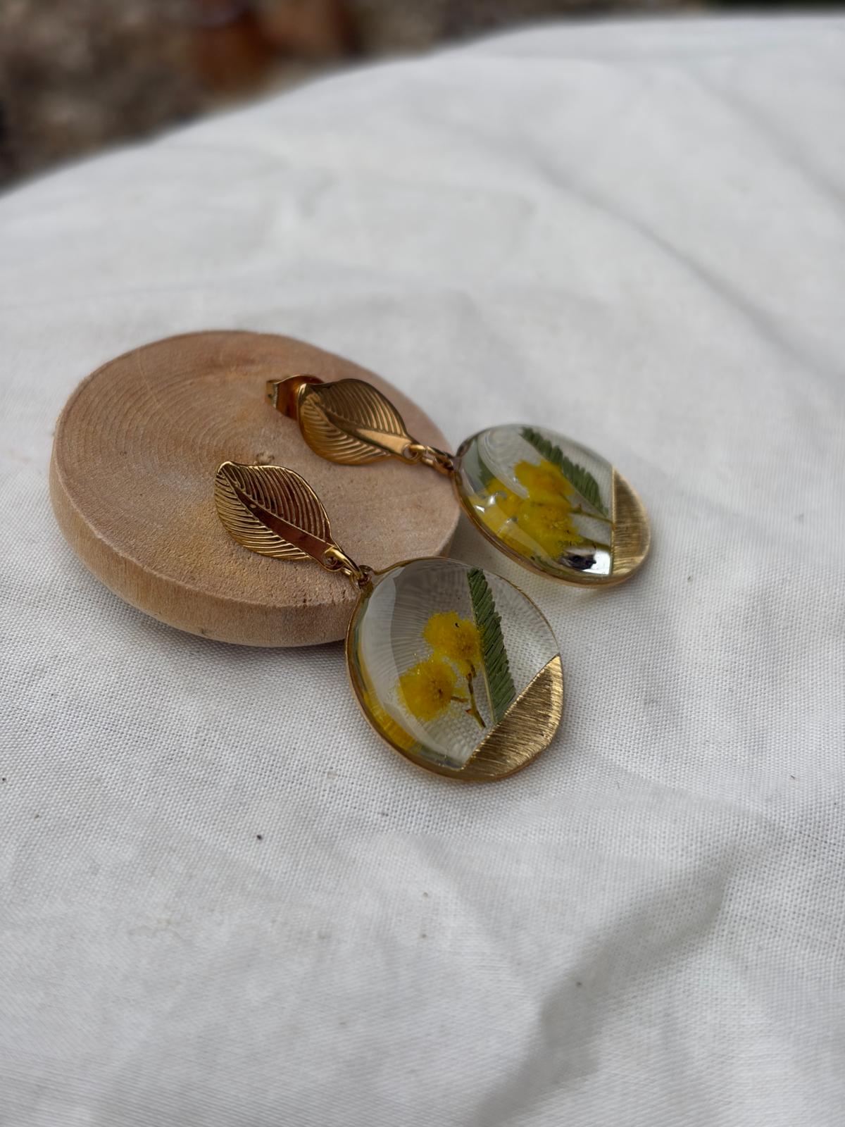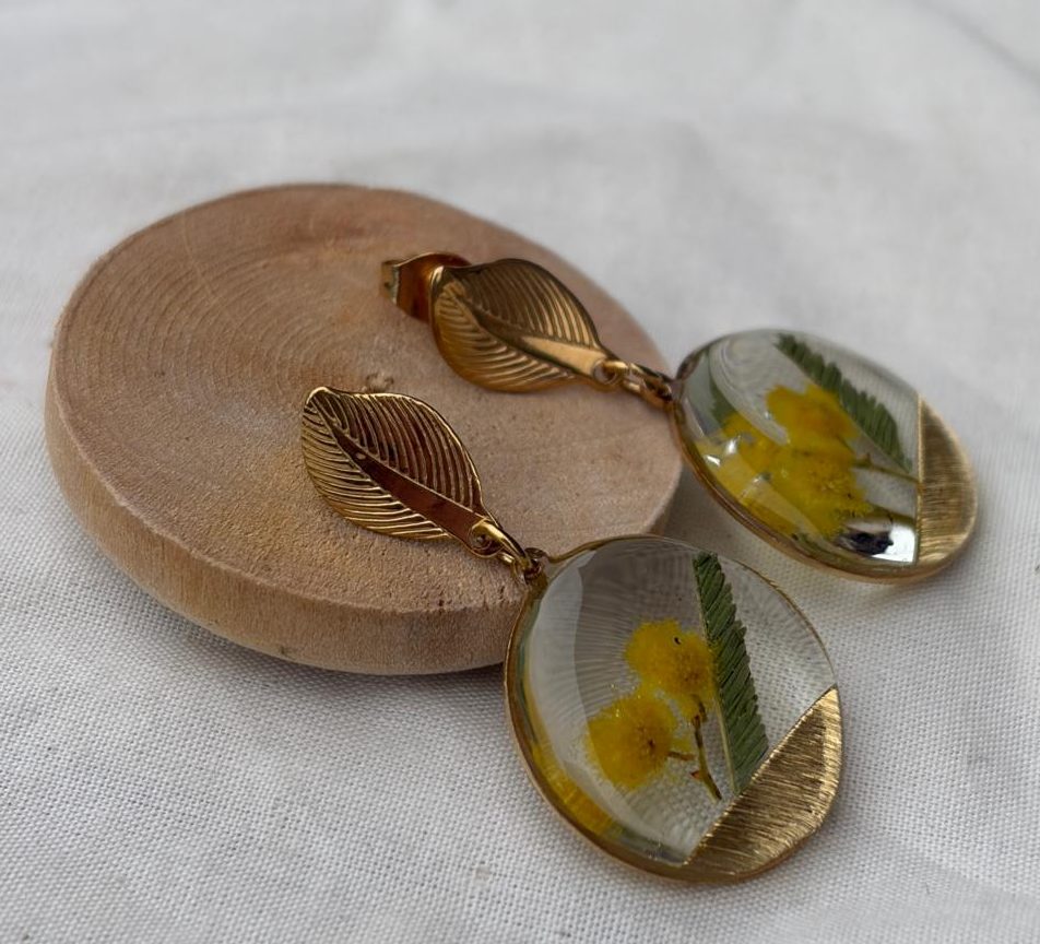 Descubre la elegancia y la frescura de nuestros pendientes de flor de mimosa natural. Cada pieza es cuidadosamente elaborada a mano, utilizando flores de mimosa recolectadas y prensadas, lo que garantiza que cada pendiente sea único y especial.