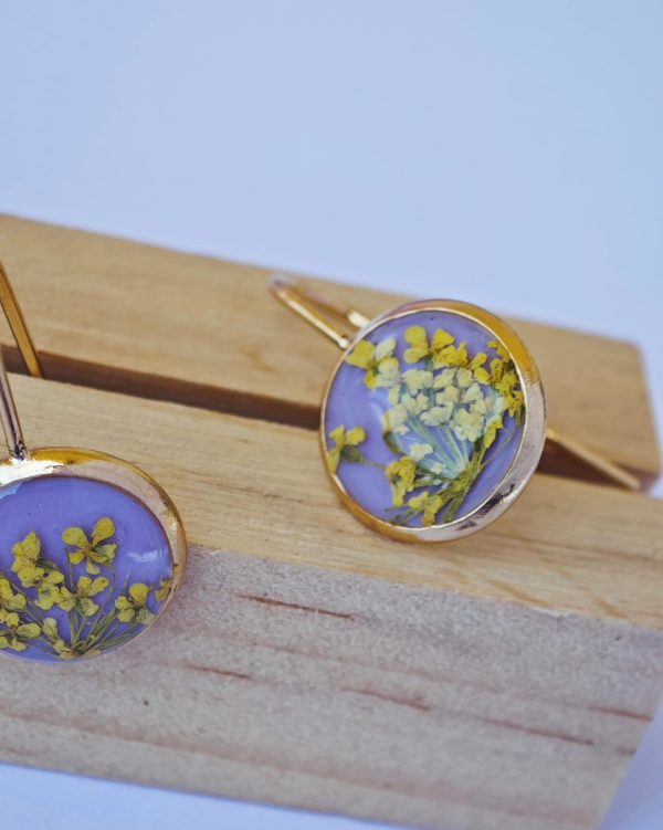 Si buscas unos pendientes elegantes y originales para completar tus looks, no puedes perderte estos pendientes de gancho rígido en esfera con encapsulado de flores secas. Estos pendientes están disponibles en color lila con las flores en amarillo, una combinación que te harán brillar con luz propia en cualquier ocasión.