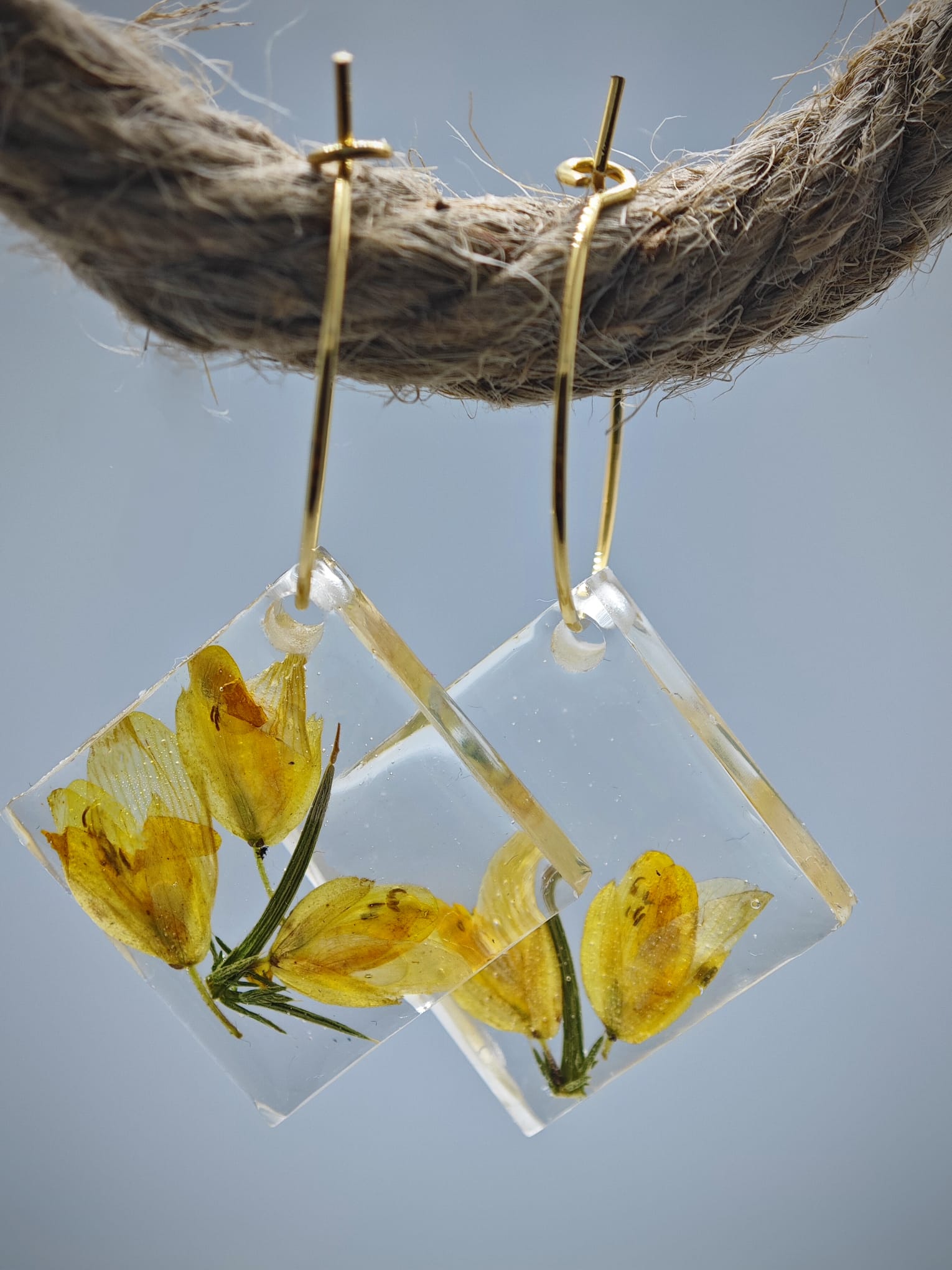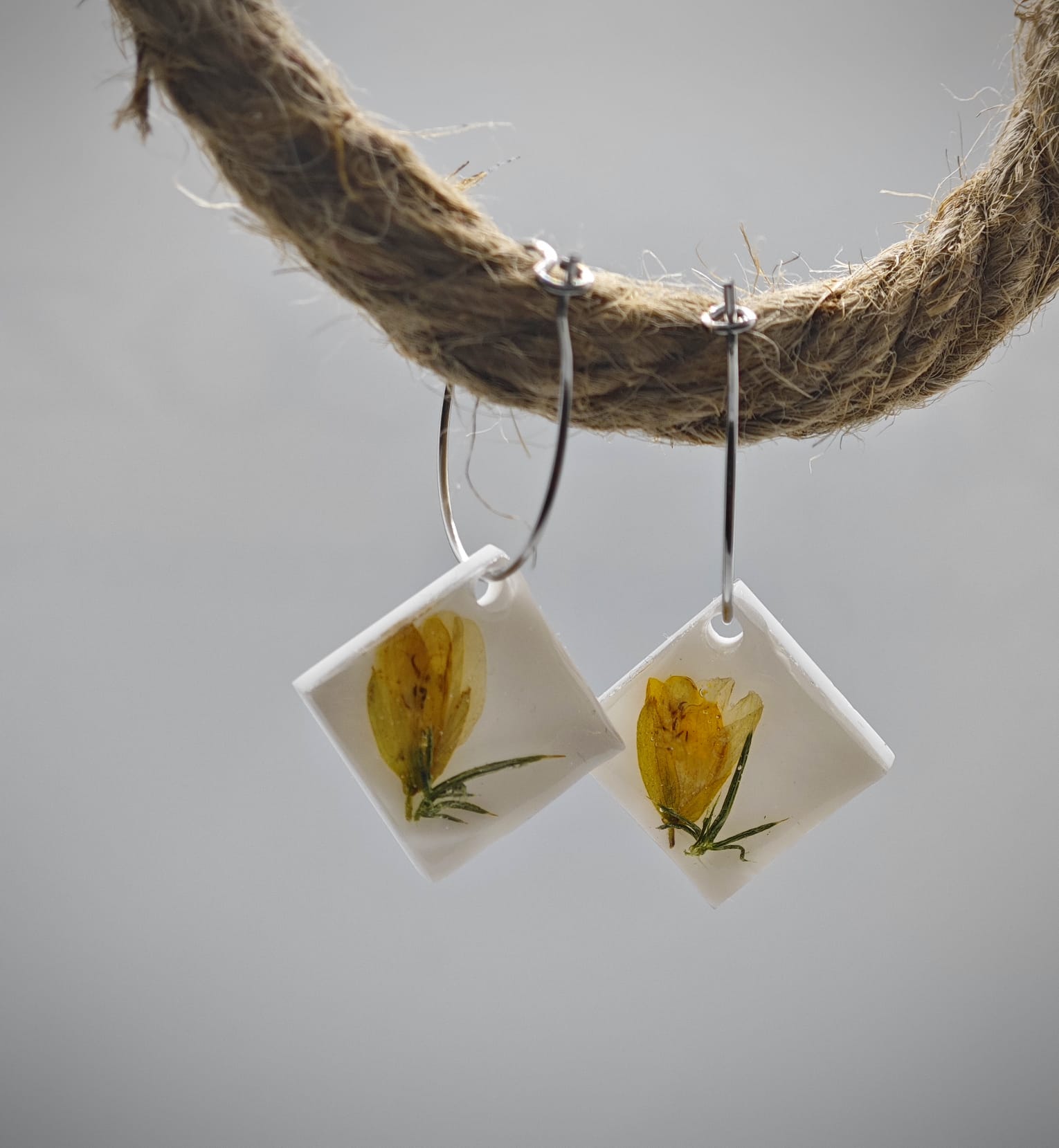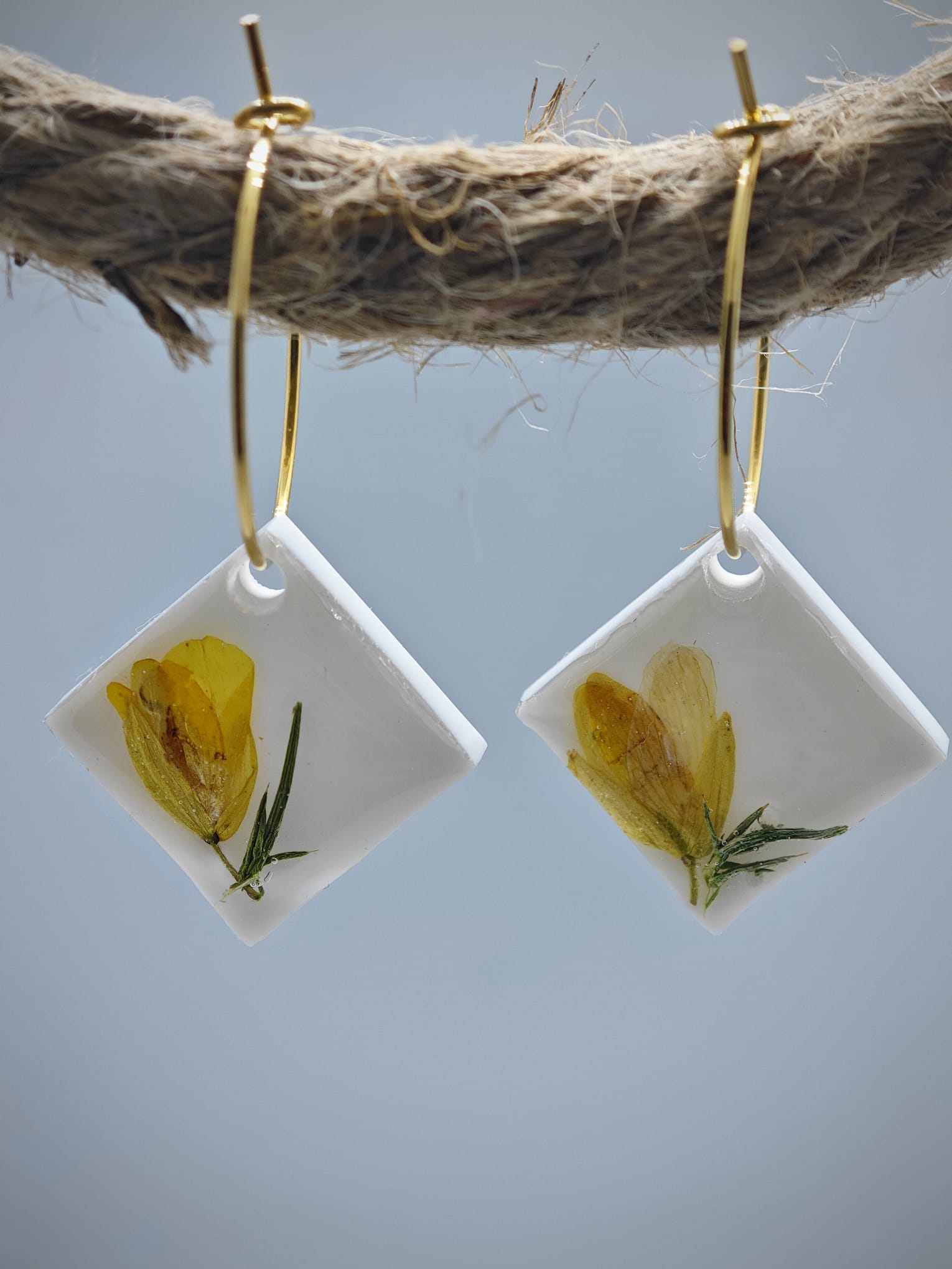 Este pendiente de aro y rombo en resina con encapsulado de toxo es una joya única y especial, con una flor típica de Galicia encapsulada en su interior. El diseño del pendiente hace que la flor destaque con un hermoso contraste de color sobre un fondo blanco, lo que le da un toque elegante y sofisticado.