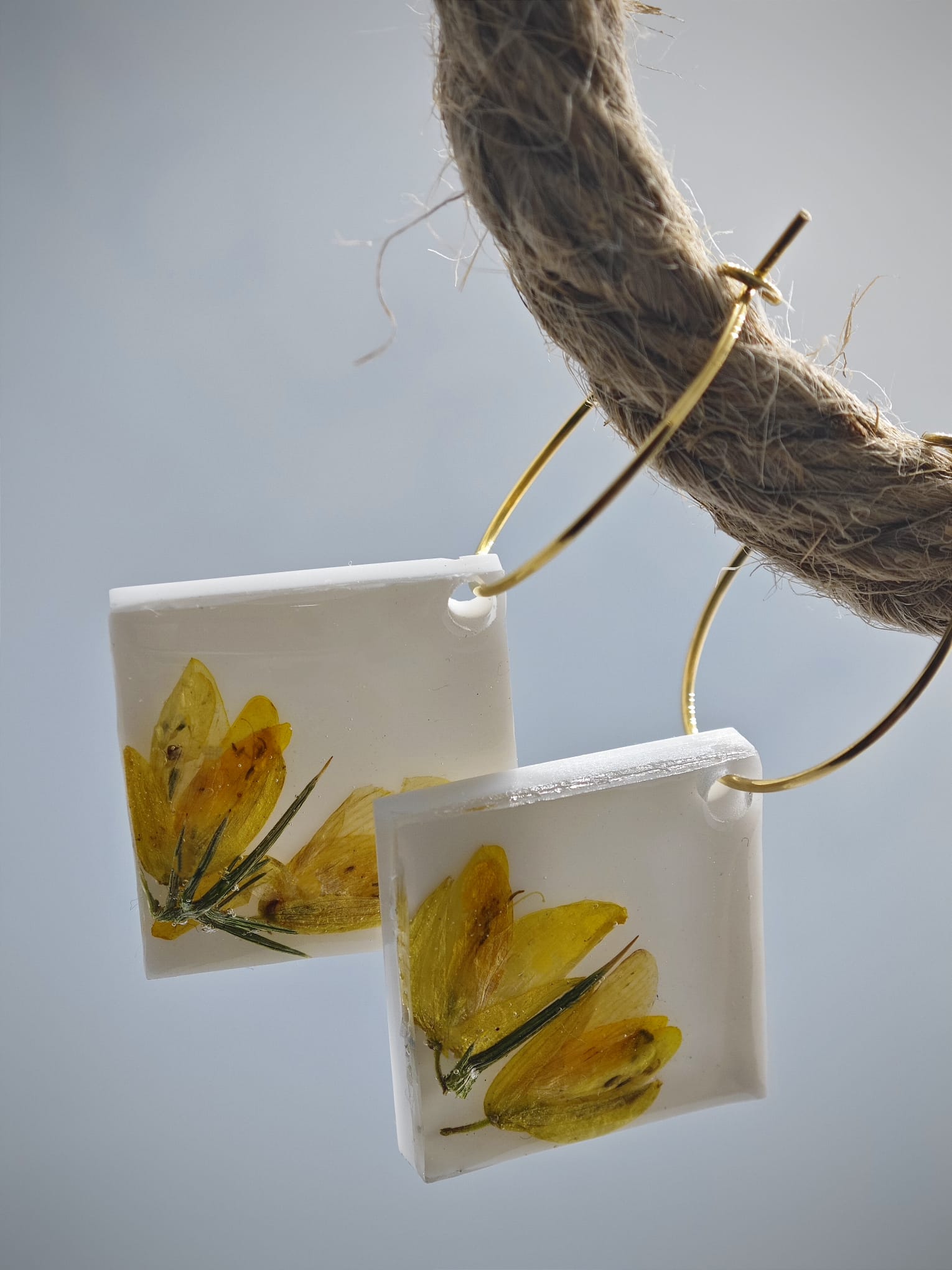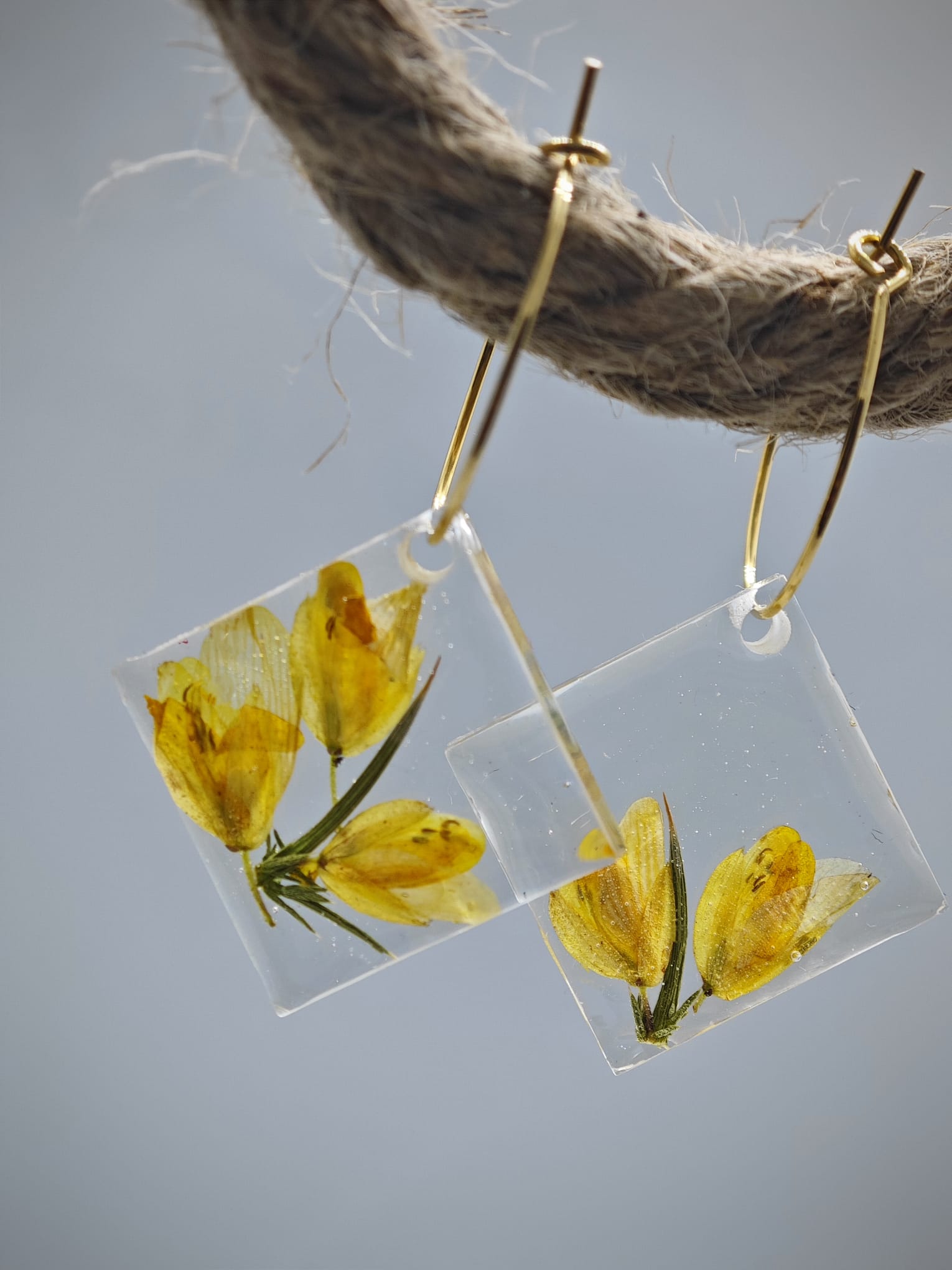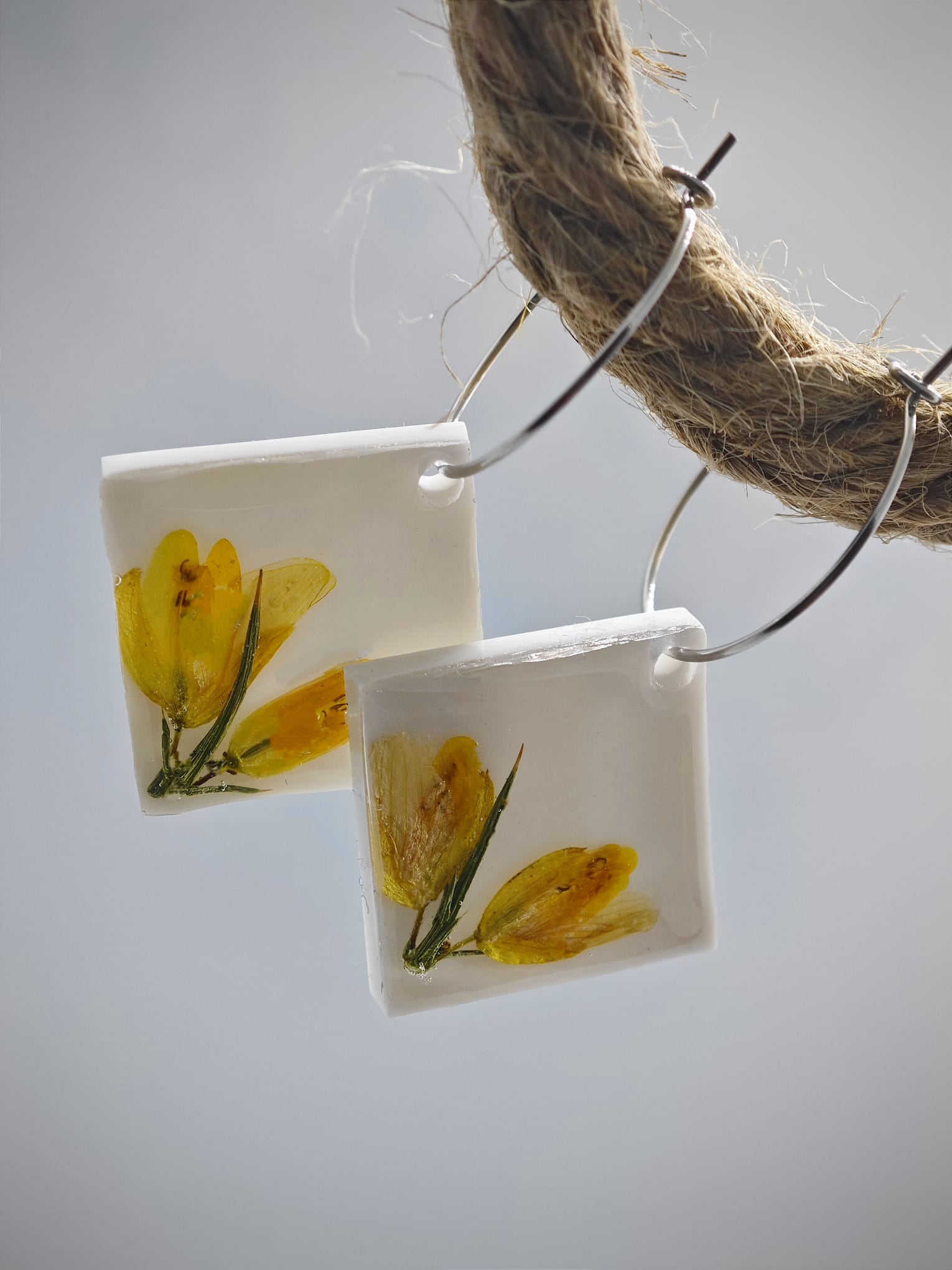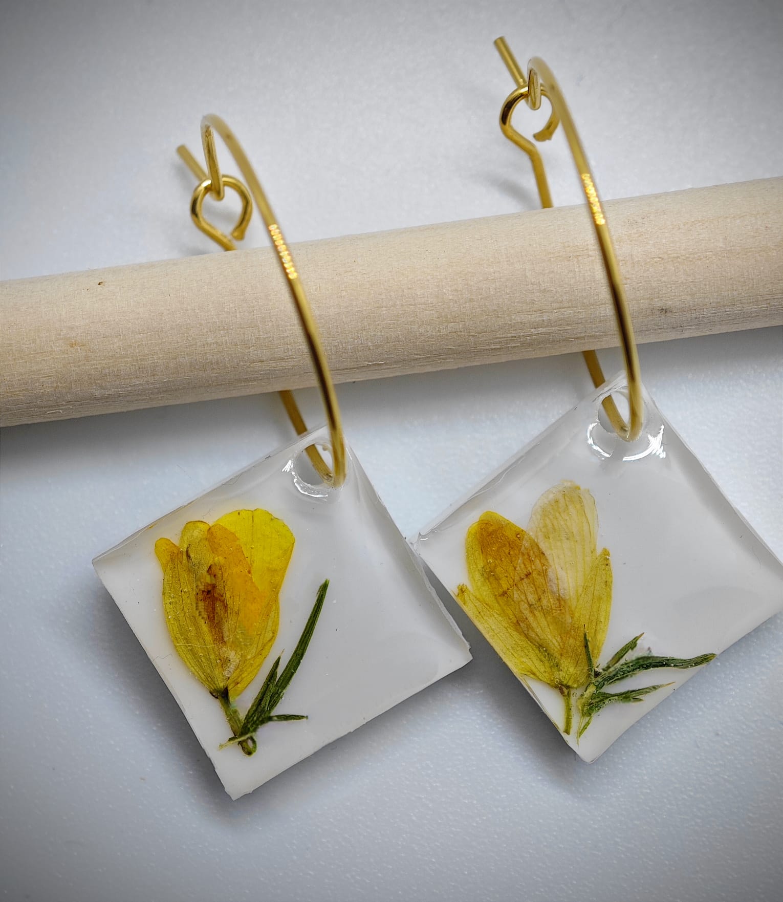 Este pendiente de aro y rombo en resina con encapsulado de toxo es una joya única y especial, con una flor típica de Galicia encapsulada en su interior. El diseño del pendiente hace que la flor destaque con un hermoso contraste de color sobre un fondo blanco, lo que le da un toque elegante y sofisticado.