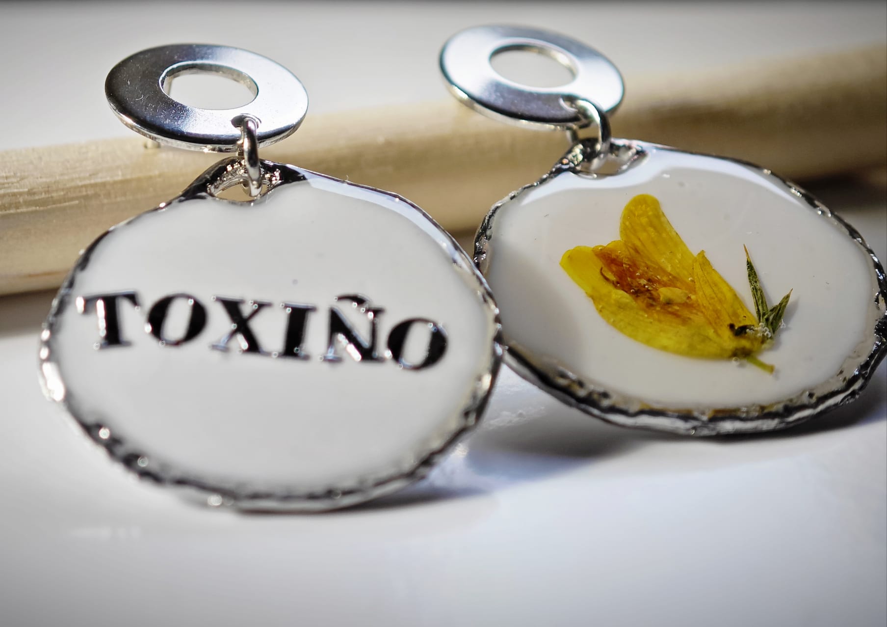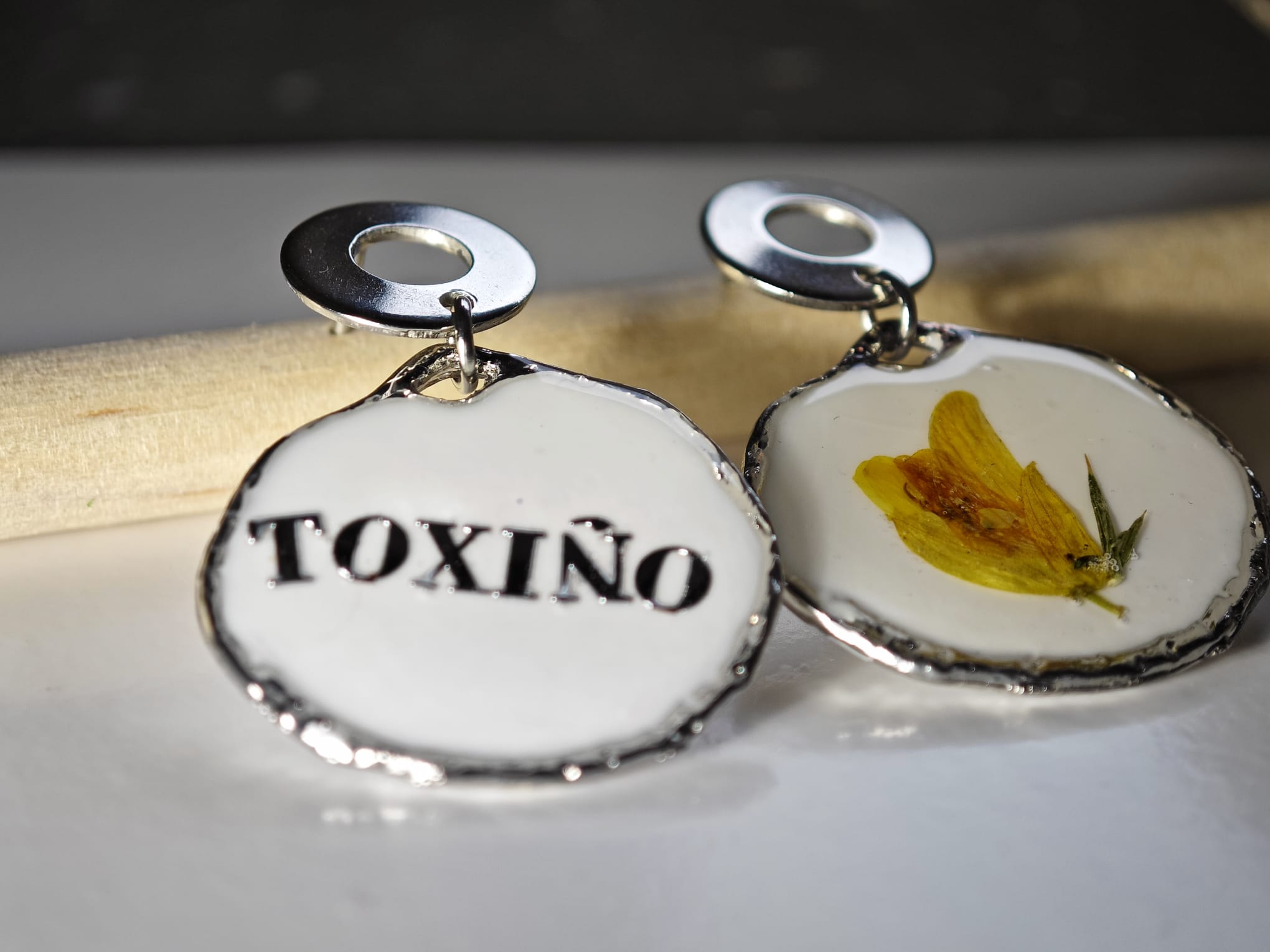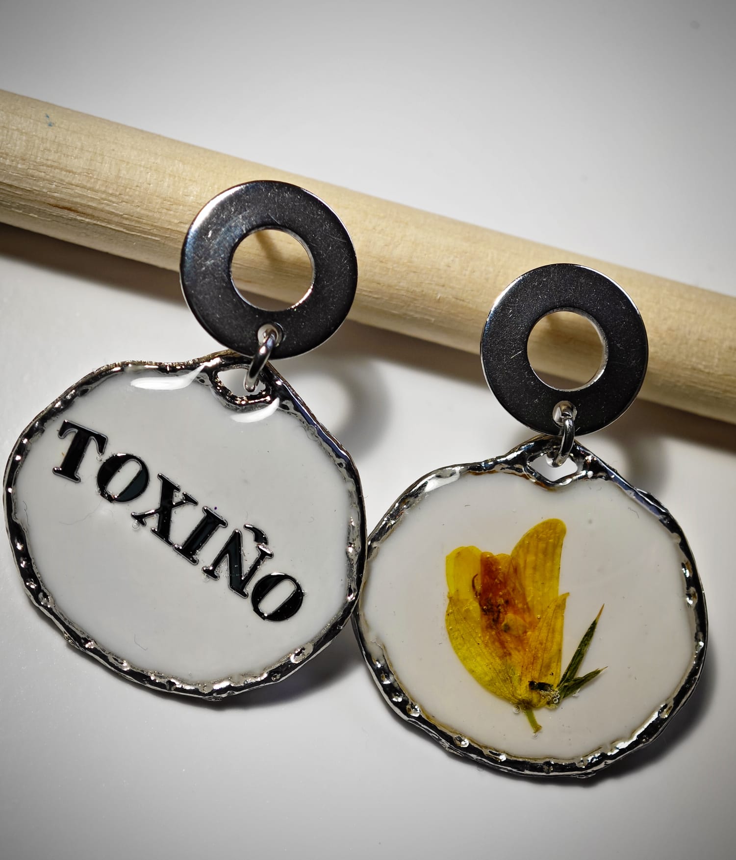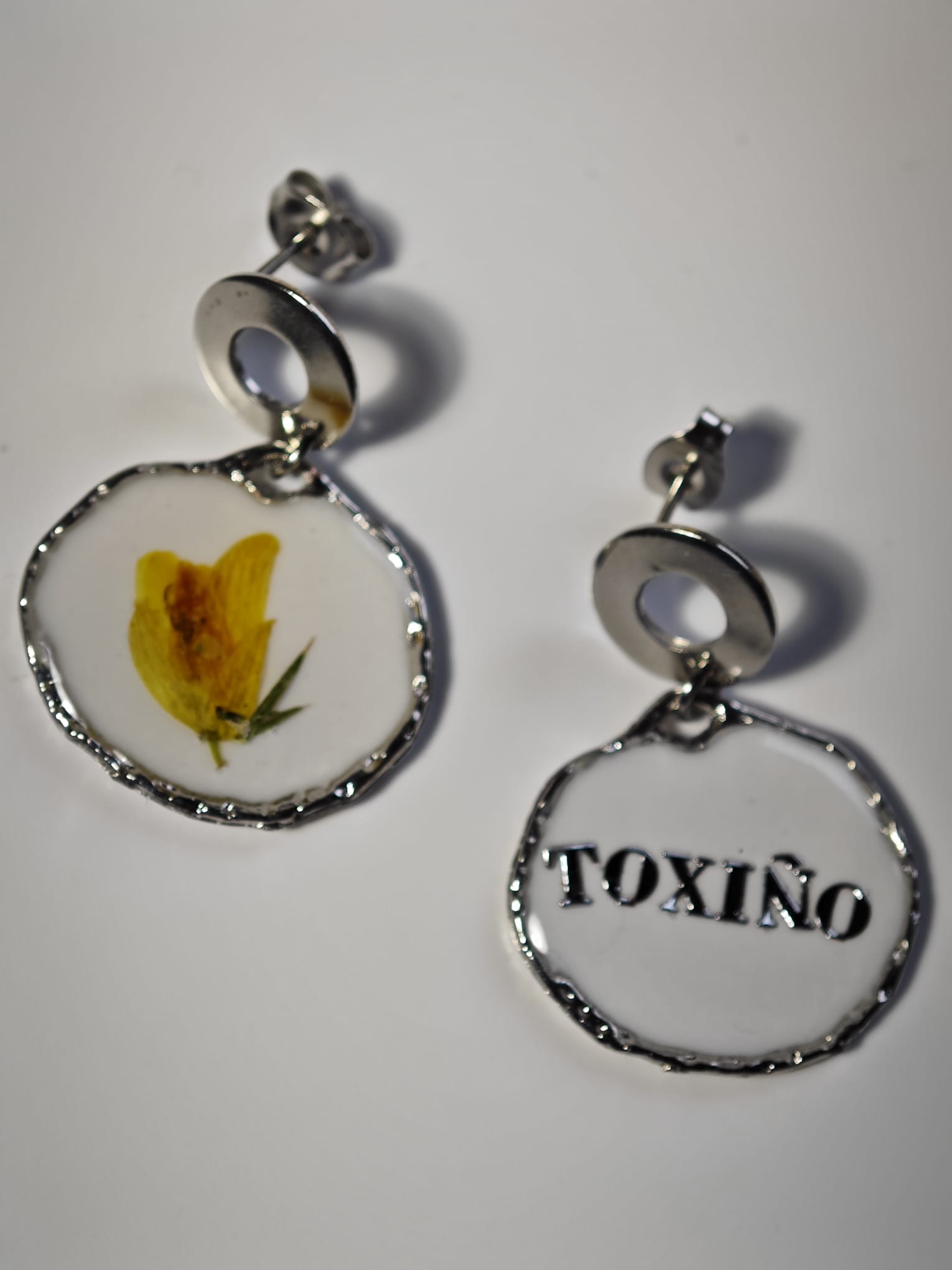 Lo que hace de estos unos pendientes tan originales, es que son diferentes, pues en uno llevas encapsulado la flor de toxo y en el otro la palabra toxiño.