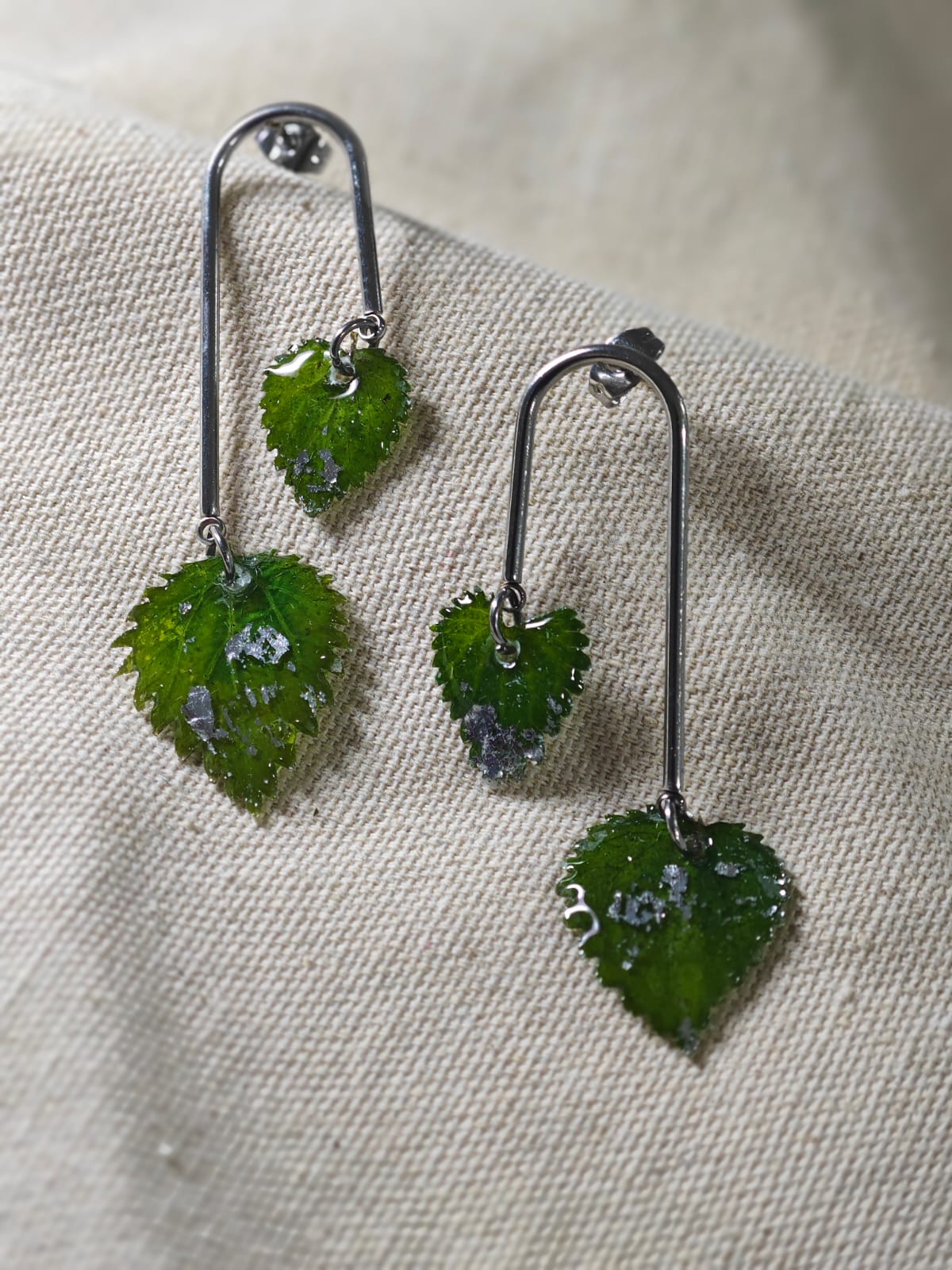 Descubre estos pendientes artesanales con hojas naturales de ortiga, una joya botánica única elaborada cuidadosamente a mano. Cada hoja es real y ha sido seleccionada y tratada para conservar su forma y textura antes de ser encapsulada en resina transparente, creando una pieza delicada, resistente y llena de personalidad.