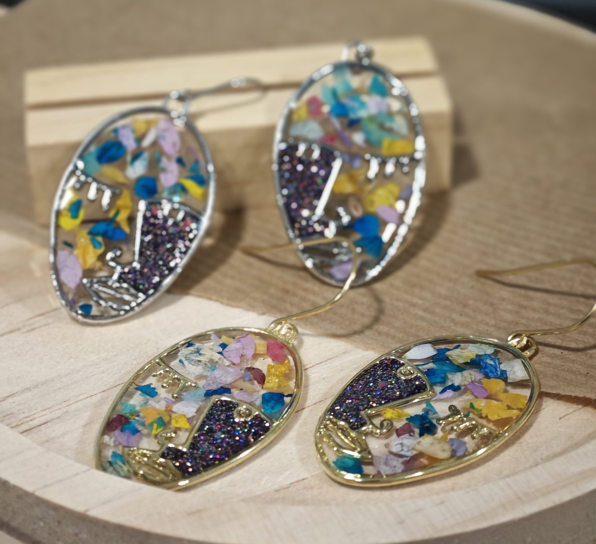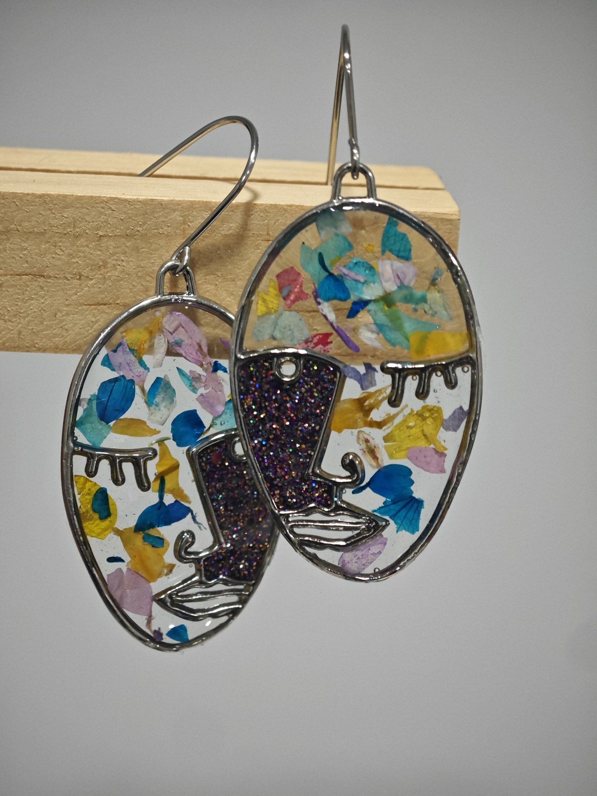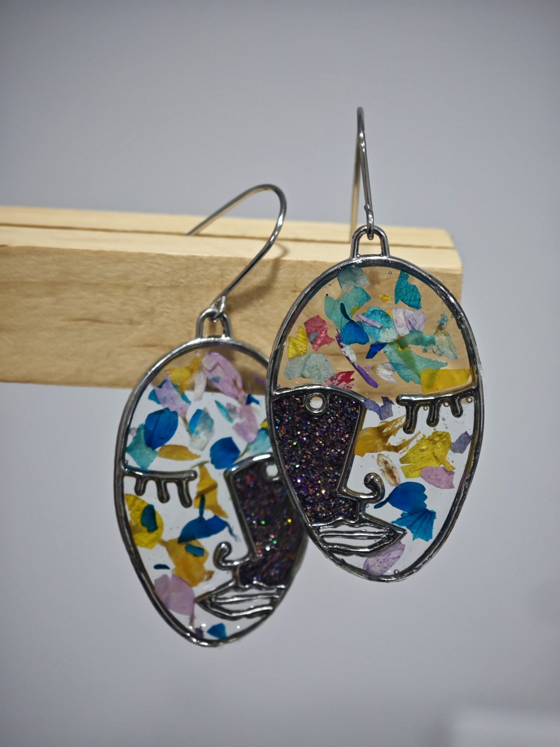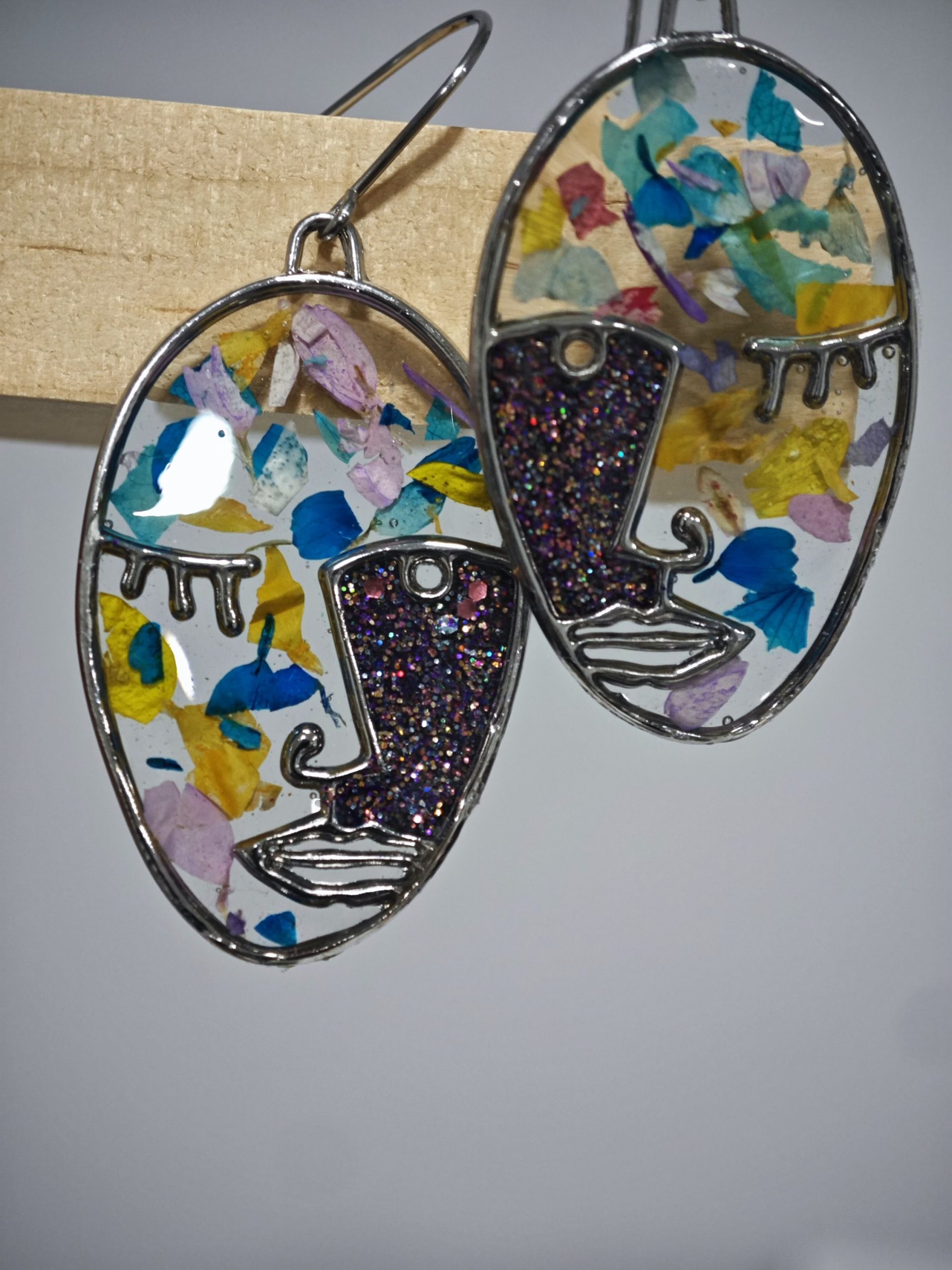 Pendientes Originales de Caras Picasianas con Glitter y Flores Naturales