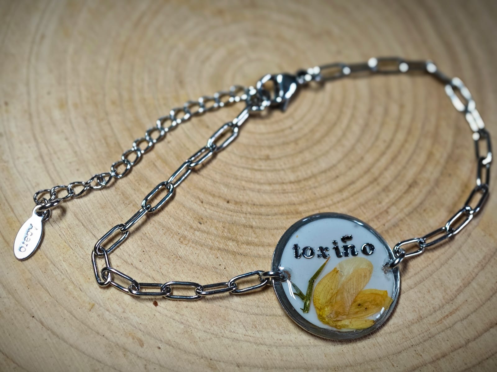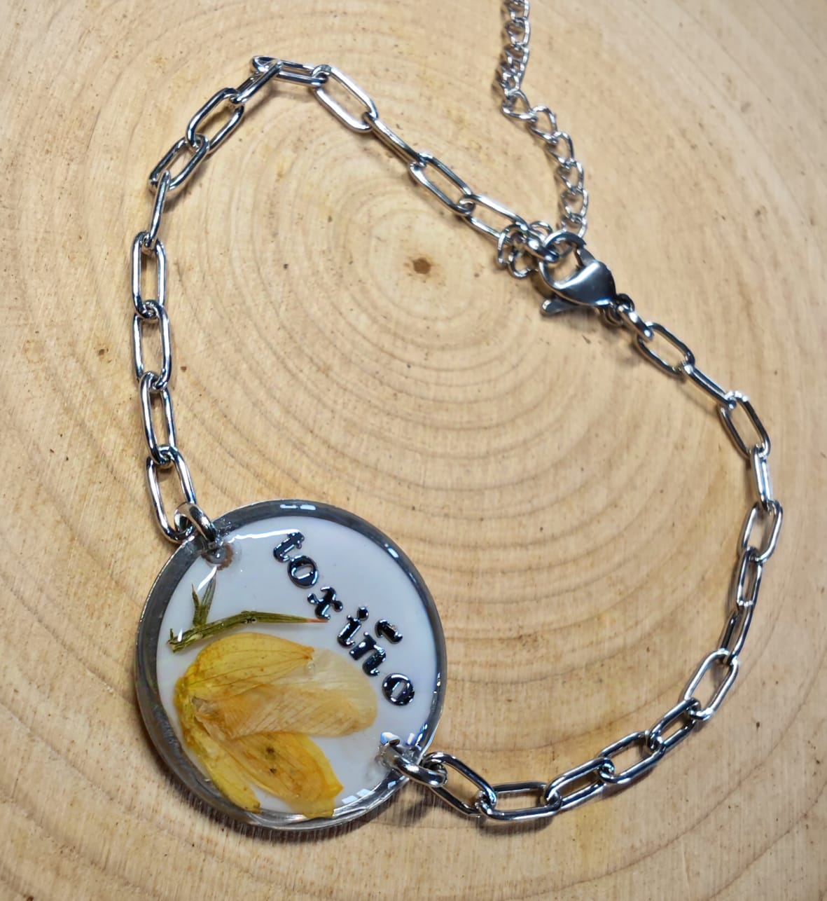 Nuestra pulsera está hecha a mano con resina y encapsulado de flor de toxo natural, lo que la hace única y con un toque de naturaleza que te encantará.